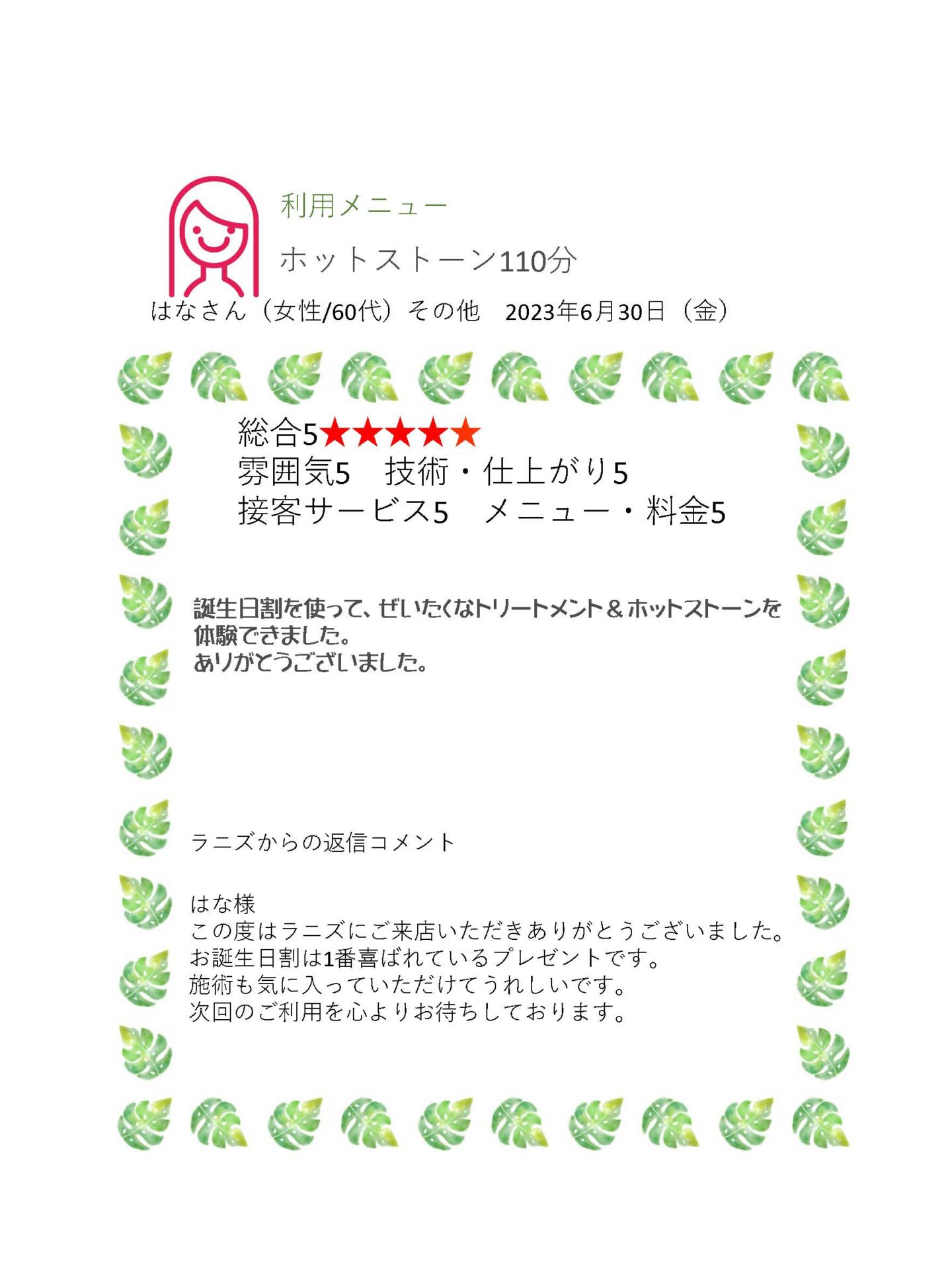この度はラニズにご来店いただきありがとうございました。