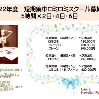 2022年度 短期集中ロミロミスクール生募集中! 大切な家族のために・人を癒してあげたい サロンメニューに加えたい方に開業までのサポートも! 1名~3名までの少人数制スクールです。 個別に好きな時間に学ぶことも可能...