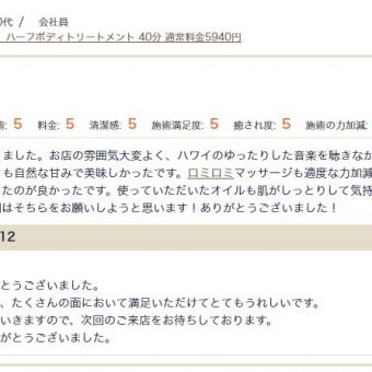 初めてロミロミのマッサージをやりました。お店の雰囲気大変よく、ハワイのゆったりした音楽を聴きながらフットバス楽しめました。はじめに出していただいた酵母ドリンクも自然な甘みで美味しかったです。ロミロミマッサージも適度な力加減で至福のひと時でした。...