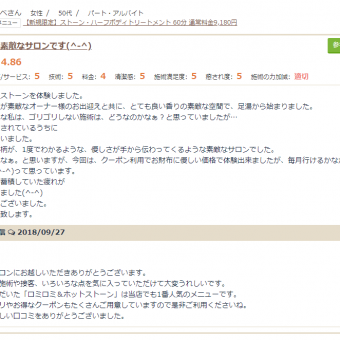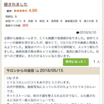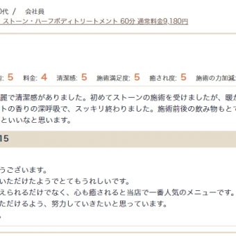 玄関から施術ルームまで、とても綺麗で清潔感がありました。初めてストーンの施術を受けましたが、暖かくて、ツルツルで手の施術と間違えるようでした。最後はペパーミントの香りの深呼吸で、スッキリ終わりました。施術前後の飲み物もとても美味しく、最高に癒されました。自分...