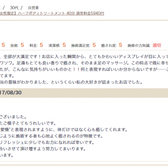 店舗の雰囲気、マッサージ、全部が大満足です!お店に入った瞬間から、とてもかわいいディスプレイが目に入ってきて、椅子に座る前からディスプレイが見たくてソワソワ。足湯もとても良い香りで癒され、そのまま足のマッサージ。この時点で既に幸せ気分です。マッ...