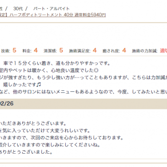 家から近く、ナビ通りに行くと、車で15分くらい着き、道も分かりやすかっです。 外はとても寒かったのですが、室内やベットは暖かく、心地良い温度でした◎ サロンにはよっては、マッサージが強すぎたり、もう少し強い方が…ってこともありますが、こちらは力...