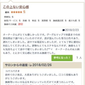 オーナーさんがとても優しかったです。グーグルマップで到着までの所要時間は下調べをしていたのですが、道が混んでいた等当日色々あり、遅れてしまいました。途中でお電話をしましたが、とても丁寧に親切に対応してくださいました。建物もとてもステキなんですが、施術もとても...