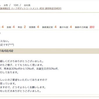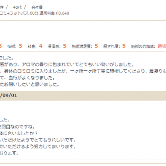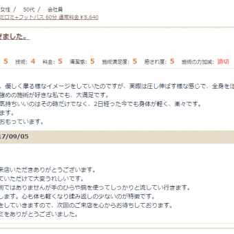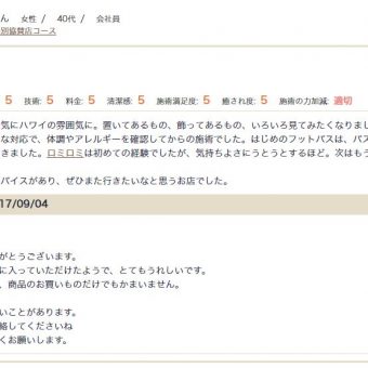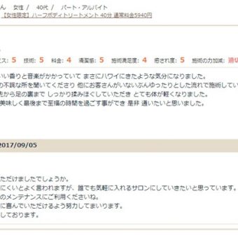 ロミロミを受けるのは2回目でした。 まずお店に入るととても清潔感があり、アロマの香りに包まれていてとてもいい匂いがしました。 フットバスをして下さった後、身体のロミロミに入りましたが、一ヶ所一ヶ所丁寧に施術してくださり、肩凝りもスッキリしました。 終わった時...