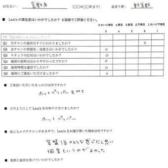 ニックネーム:M 年齢:24歳 お住まい:倉敷市 最寄り駅:新倉敷 利用メニュー:サウナ Q1.当サロンの場所はすぐにわかりましたか? ・・・ 不満足 Q2.当サロンの雰囲気・清潔さはいかがでしたか? ・・・ 大いに満足 Q3.スタッフの応対は...