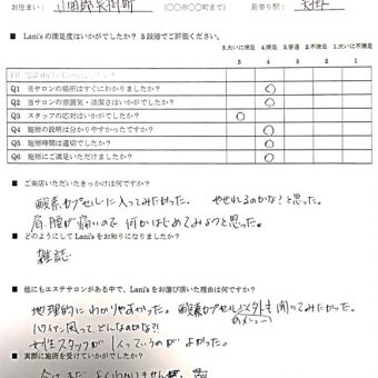 ニックネーム:ユキ 年齢:35歳 お住まい:総社市清音 最寄り駅:清音 利用メニュー:カプセル30 Q1.当サロンの場所はすぐにわかりましたか? ・・・ 大いに満足 Q2.当サロンの雰囲気・清潔さはいかがでしたか? ・・・ 大いに...