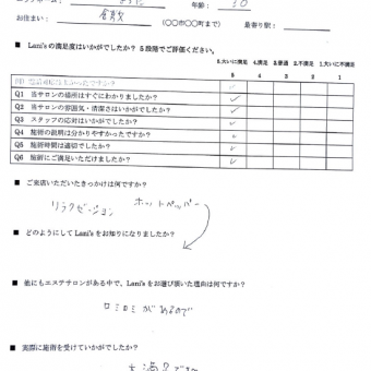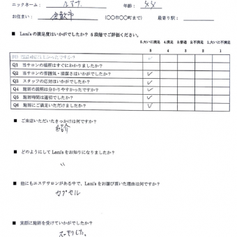 ニックネーム:まちた 年齢:30歳 お住まい:倉敷市 利用メニュー:イーポレーション Q1.当サロンの場所はすぐにわかりましたか? ・・・ 大いに満足 Q2.当サロンの雰囲気・清潔さはいかがでしたか? ・・・ 大いに満足 Q3.スタッフの応対は...