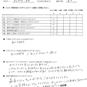 ニックネーム:yoshi 年齢:32 お住まい:倉敷市真備町 最寄り駅:清音 Q1.当サロンの場所はすぐにわかりましたか? ・・・ 大いに満足 Q2.当サロンの雰囲気・清潔さはいかがでしたか? ・・・ 大いに満足 Q3.スタッフの...