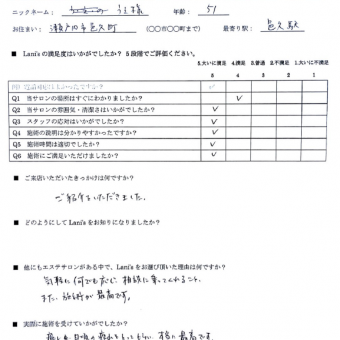 ニックネーム:ひろこ 年齢:30 お住まい:総社市門田 最寄り駅:総社駅 Q1.当サロンの場所はすぐにわかりましたか? ・・・ 普通 Q2.当サロンの雰囲気・清潔さはいかがでしたか? ・・・ 大いに満足 Q3.スタッフの応対はいか...