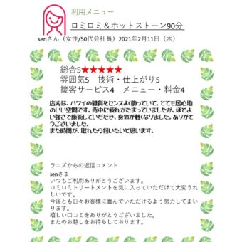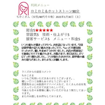 初めて60分をお願いしました。とっても清潔感のある広々とした店内でゆっくりリラックス出来ました。気付いたら気持ちよくてウトウトしてしまいました。またよろしくお願いいたします(*^^*) ラニズからの返信コメント こ...