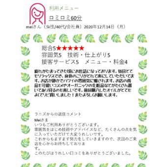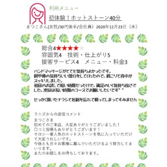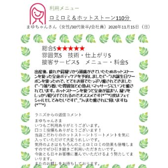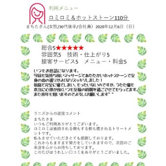 いつもお世話になります。今回も気持ち良いマッサージとあたたかいホットストーンで全身の血の巡りがよくなりスッキリしました!毎度と完全に寝てしまい、もったいないのですが、うたた寝も本当に心地が良くいつも至福の時間を過ごさせてもらってます。また...